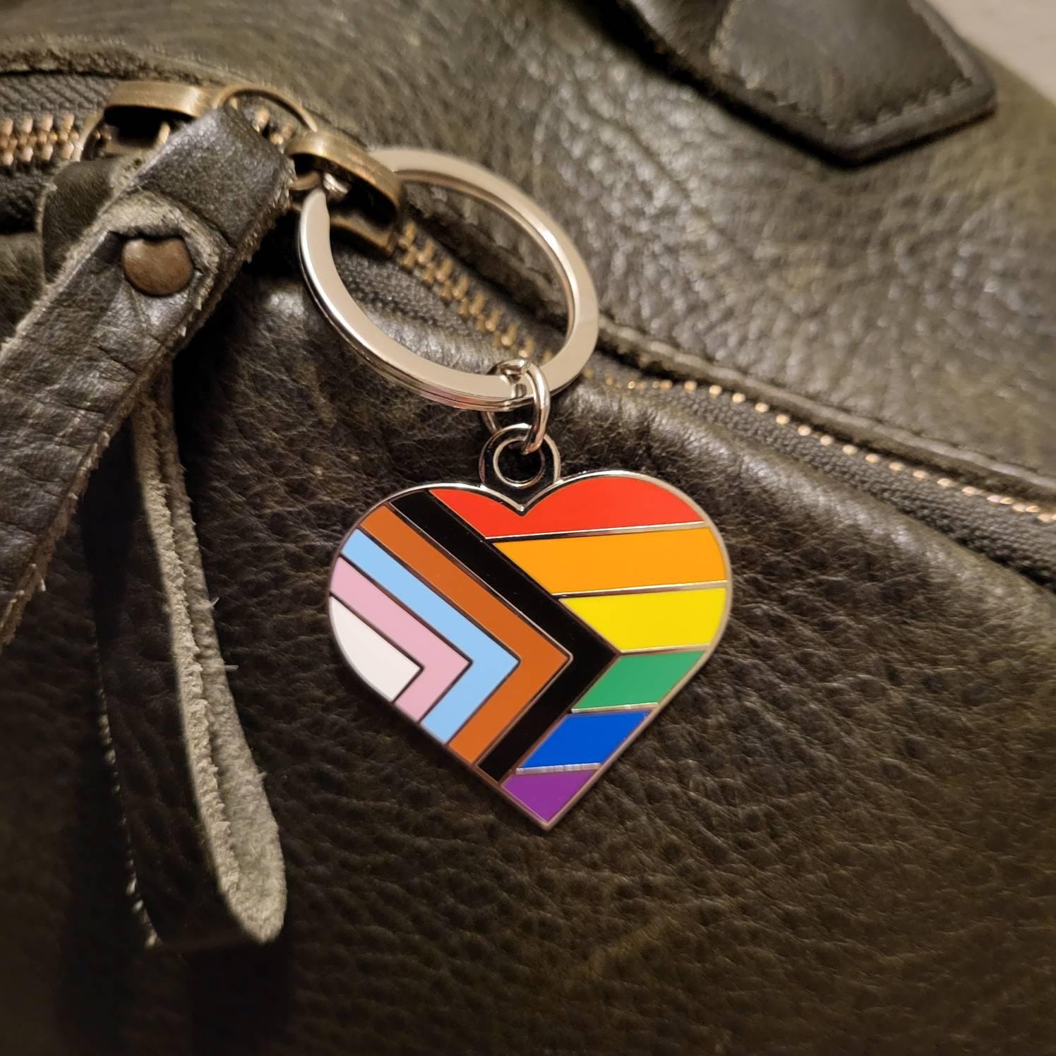 Carry a symbol of love and inclusion with this Heart Progress Pride Flag enamel keychain. Perfect for keys, bags, or accessories, it proudly celebrates LGBTQ+, POC, and transgender pride.
