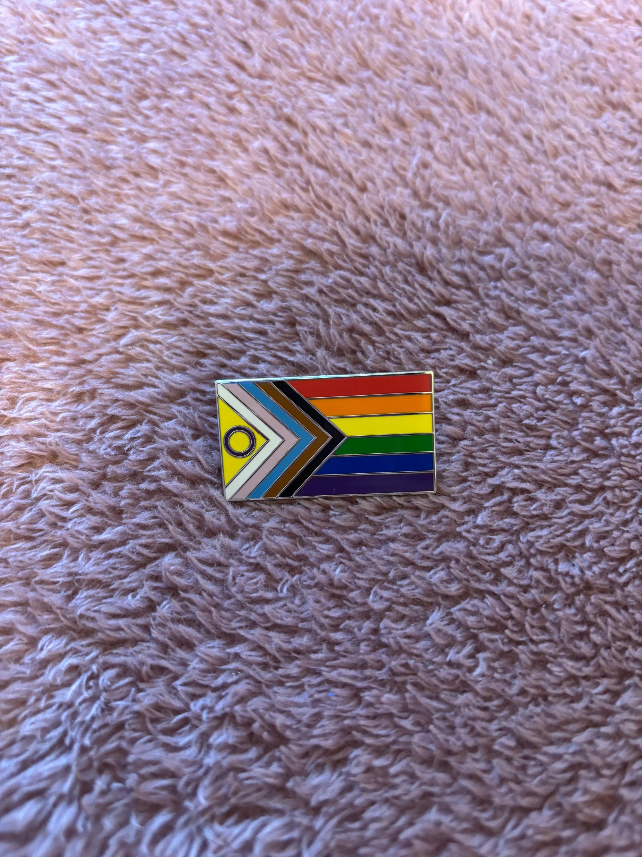 Embody the progress of the LGBTQ+ movement with our Intersex Inclusive Progress Pride Flag Enamel Pin. This updated design incorporates the traditional rainbow colors with additional stripes to represent marginalized LGBTQ+ communities of color, the trans community, and the intersex community.