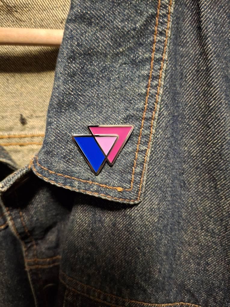 · Unique Design: The pin features two overlapping triangles adorned with the distinct pink, purple, and blue colors of the bisexual pride flag, symbolizing the diversity and unity within the bisexual community.