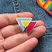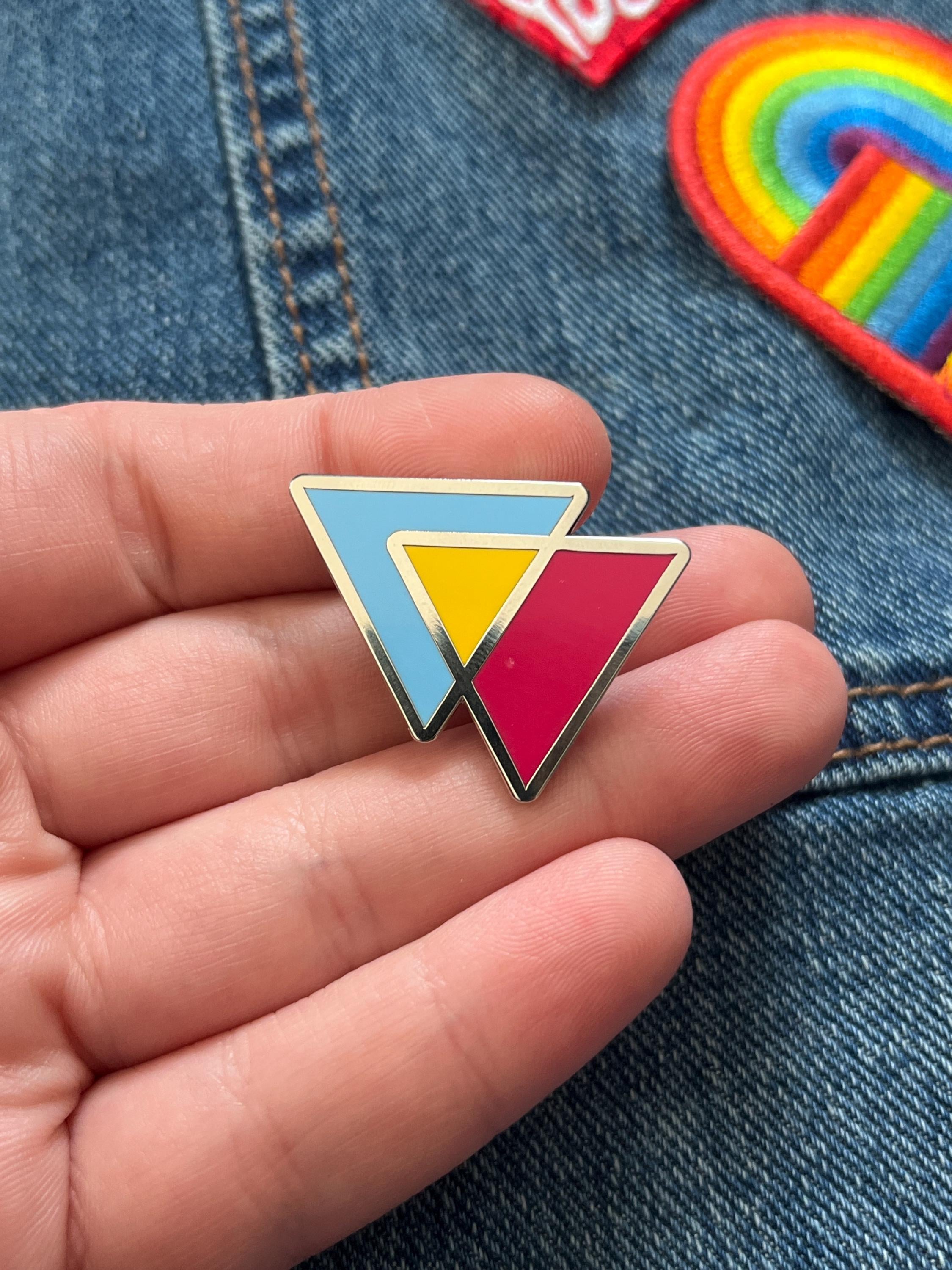 • Distinctive Design: The pin showcases two overlapping triangles filled with the bright pink, yellow, and blue stripes of the pansexual pride flag, representing attraction to all genders.